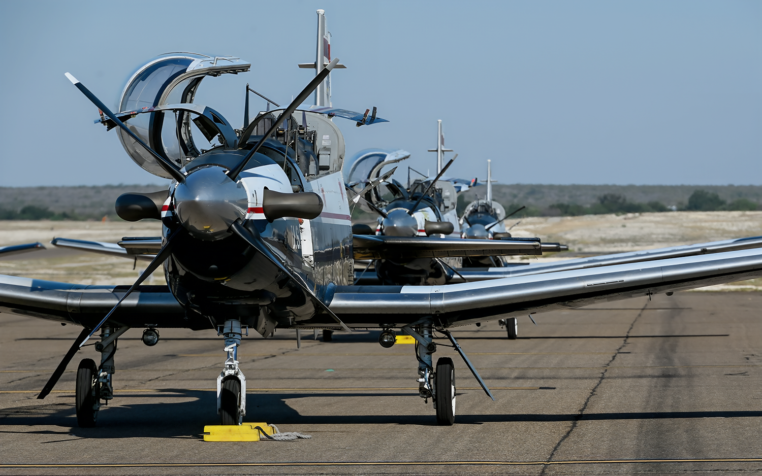 Three T-6A Texan II’s sit on the flightline during a training event at Del Rio International Airport in Del Rio, Texas, Sept. 30, 2025. Operators launched over 70 sorties from Laughlin before noon, approximately 20 more than a typical day of operations, contributing to 169 total sorties flown at Del Rio International Airport that day. (U.S. Air Force photo by Senior Airman Jarrett Smith